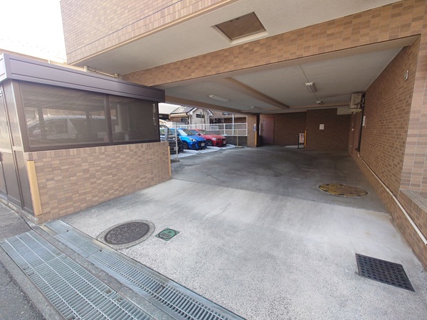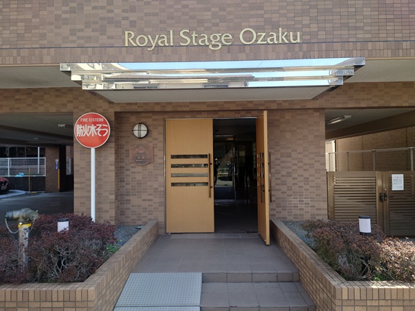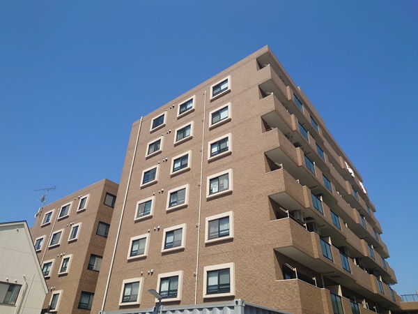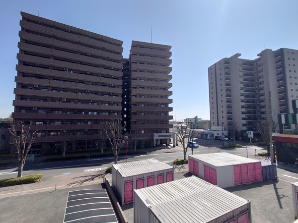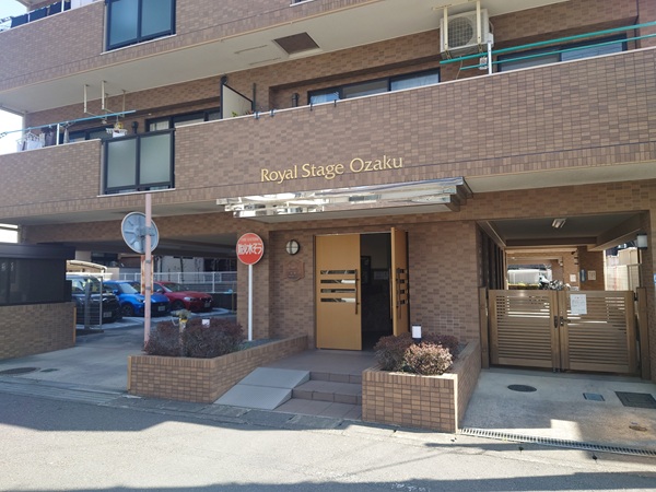 駅から適度に離れた分譲マンションです。エントランス前は車通りも少なく、大通りにも面していません。